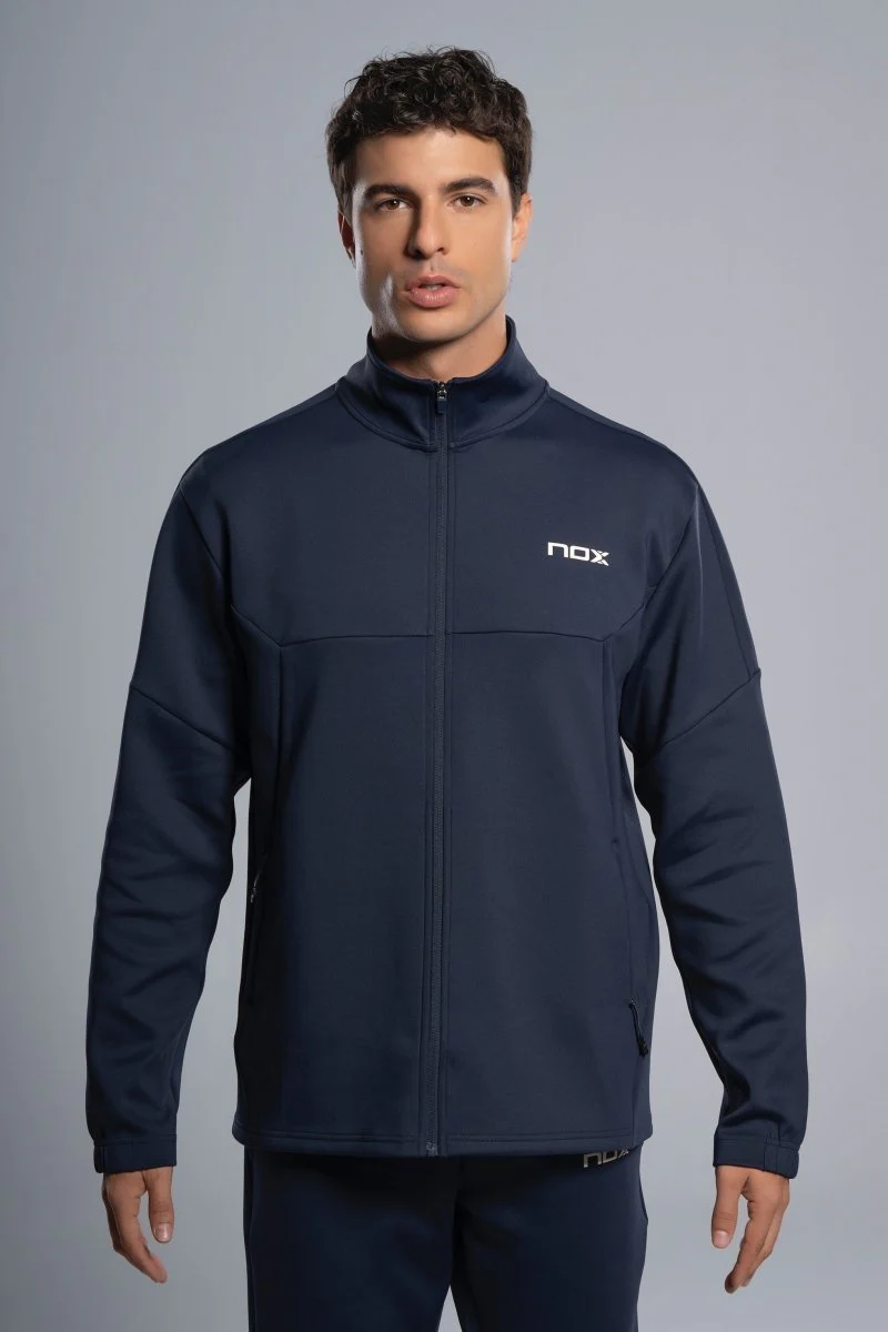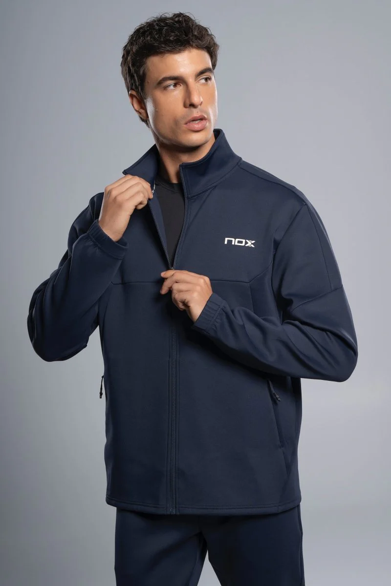 Idealna zarówno na intensywne treningi, jak i chwile relaksu – sportowa kurtka w eleganckim, stonowanym granatowym kolorze.